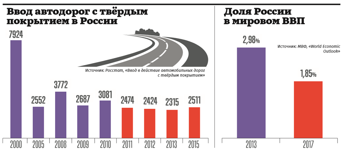 Вводы автодорог в целом при Путине упали с 8 тыс. км в год в 2000 году до 2–2,5 тыс. км в последние годы.
